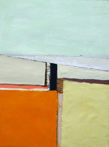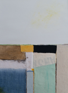 2022Geabstraheerde weergave van een landschap. Collage van acrylverf, gouache, gesso en textiel op aquarelpapier.